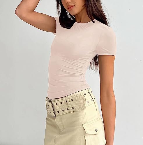 Famulily Women’s Round Neck Slim Fitted T-Shirts Basic Short Sleeve Workout Top, Tight Club Going Out Party Summer Tee Shirts S to XL