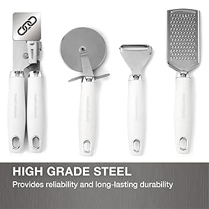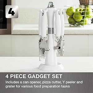 Includes a can opener, pizza cutter, Y peeler and grater for a wide range of food preparation tasks