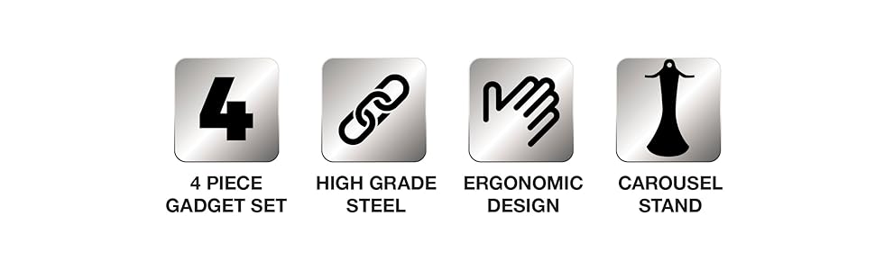4 Piece stainless steel gadget set includes a Can Opener/Pizza Cutter/Y Peeler/Grater High grade stainless steel functional components Ergonomically designed handles Rotatable carousel stand Not suitable for dishwasher/ Hand wash recommended Part of the Morphy Richards Dune collection