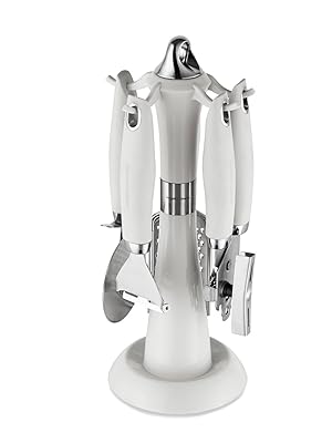 The set is comprised of a can opener, pizza cutter, Y peeler and grater, with each featuring ergonomically designed handles to provide high quality comfort and control when in use. Its high-grade stainless steel structure adds an extra level of durability so you can use them for years to come. The rotating carousel stand provides convenient storage so your kitchen surface remains neat and tidy. This 4 piece gadget set is not suitable for the dishwasher so a hand wash is recommended.