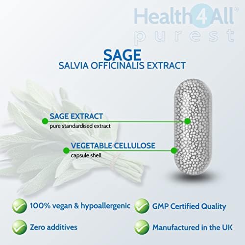 Sage Strong 2500mg 60 Capsules (V). Sage Leaf Extract for Hot Flushes, Night Sweats and Menopause Symptoms. Vegan. Made by Health4All